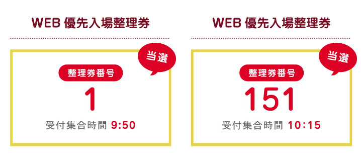 上記WEB優先入場整理券に当選されたお客様は、4/11(土)は9:50もしくは10:15の集合、4/12(日)9:50の集合となる予定です。