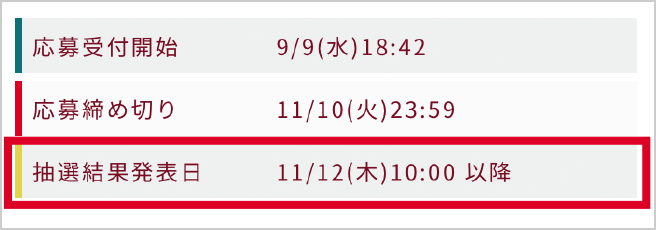 抽選結果発表日時以降、マイページTOPの「抽選結果の確認」ボタンを選択してください。